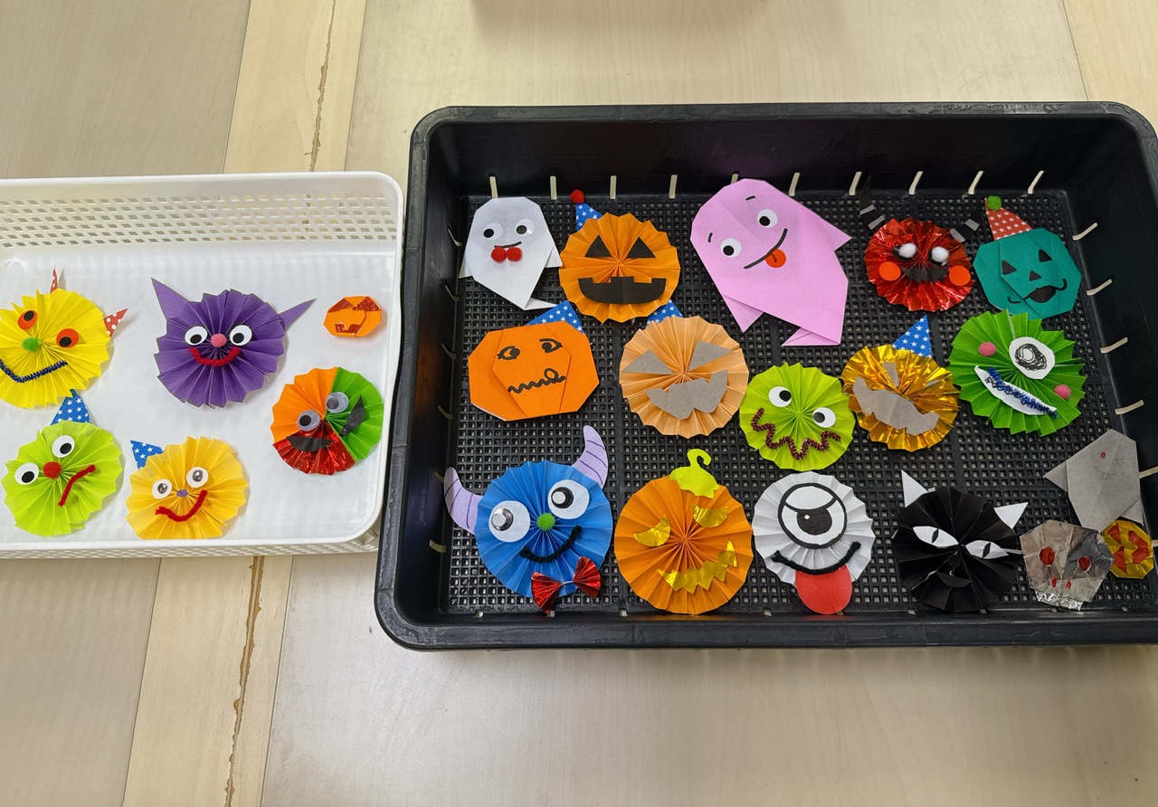 折り紙やモール、シール等を用いてモンスターやジャック・オ・ランタン、おばけ等を